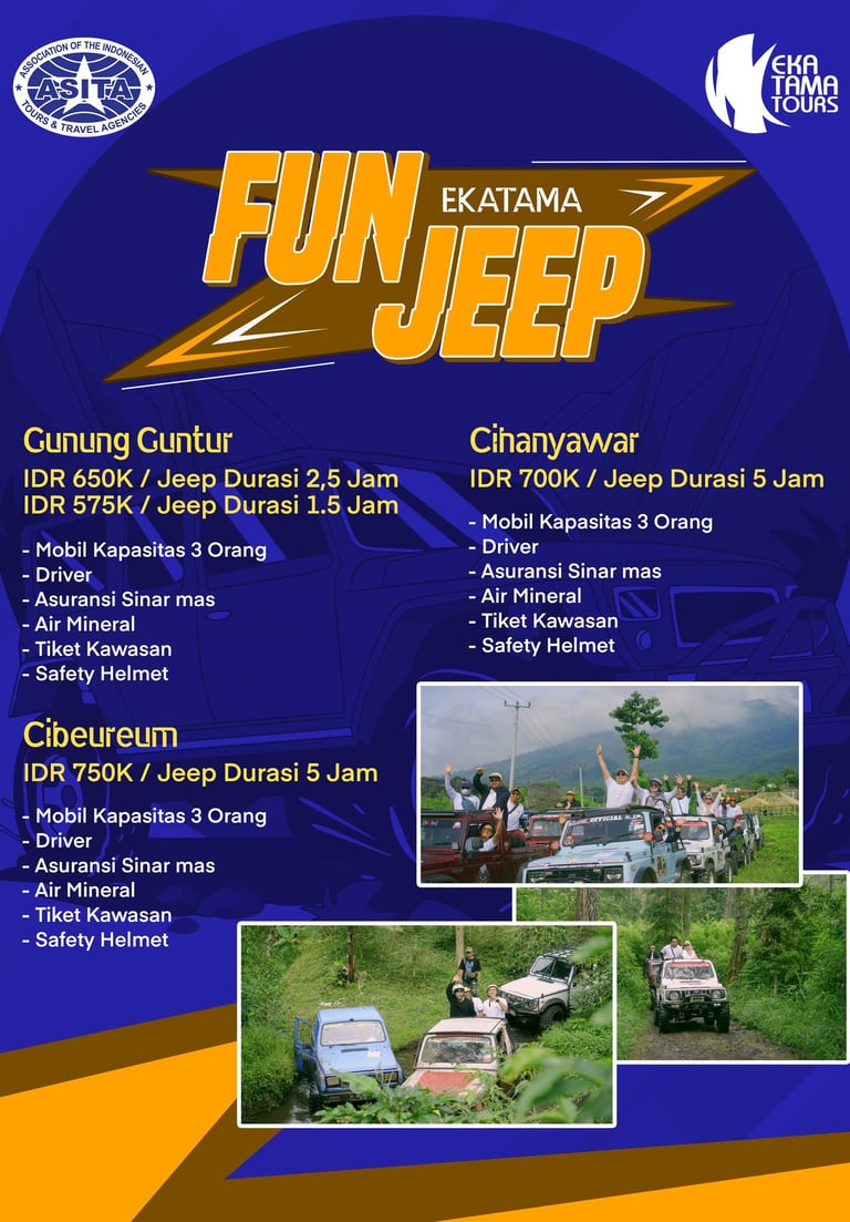 Paket ekatama fun jeep merupakan pilihan ideal bagi Anda yang mencari pengalaman seru di Garut. Dengan menggunakan jeep yang tangguh, Anda akan diajak menjelajahi keindahan Gunung Guntur, Cikuray, dan Situ Cibeureum.